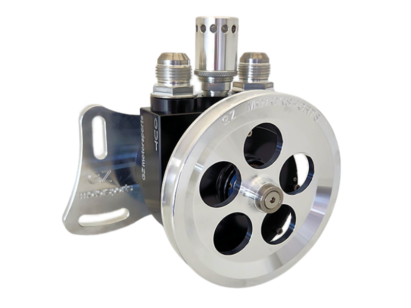 The GZ Motorsports VP105 Lightweight Billet Racing Vacuum Pump Complete Kit features our VP105 Pump with #12 AN Aluminum Phenix fittings, the VCV101A Vacuum Control Valve and the SB100 Mount for Small & Big Block Chevy or Motor Plate Applications.